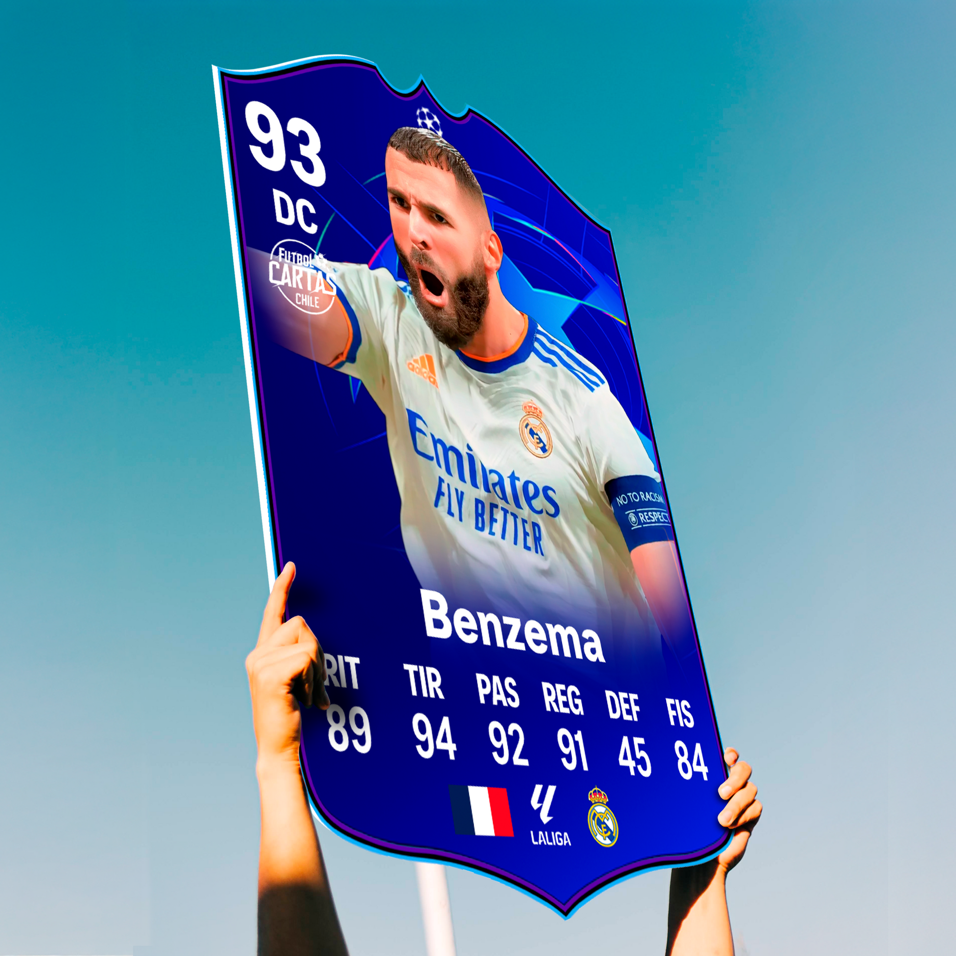 Llévate la carta de Benzema UCL Primetime FC26 en tamaño real. Es un diseño original de Futbol Cartas Chile, inspirado en el estilo de las cartas especiales de los videojuegos de fútbol. Ideal para fans de Benzema y coleccionistas que quieren llevar su pasión por el fútbol a la vida real con una carta en gran formato. Perfecta como regalo futbolero o para decorar tu pieza, gaming room o espacio de colección.