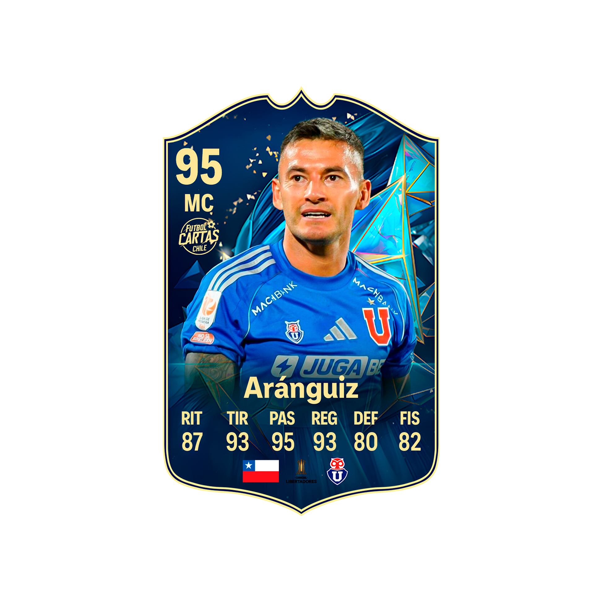 Llévate la carta de Charles Aranguiz TOTS FC25 en tamaño real. Es un diseño original de Futbol Cartas Chile, inspirado en el estilo de las cartas especiales de los videojuegos de fútbol. Ideal para fans de Charles Aranguiz y coleccionistas que quieren llevar su pasión por el fútbol a la vida real con una carta en gran formato. Perfecta como regalo futbolero o para decorar tu pieza, gaming room o espacio de colección.