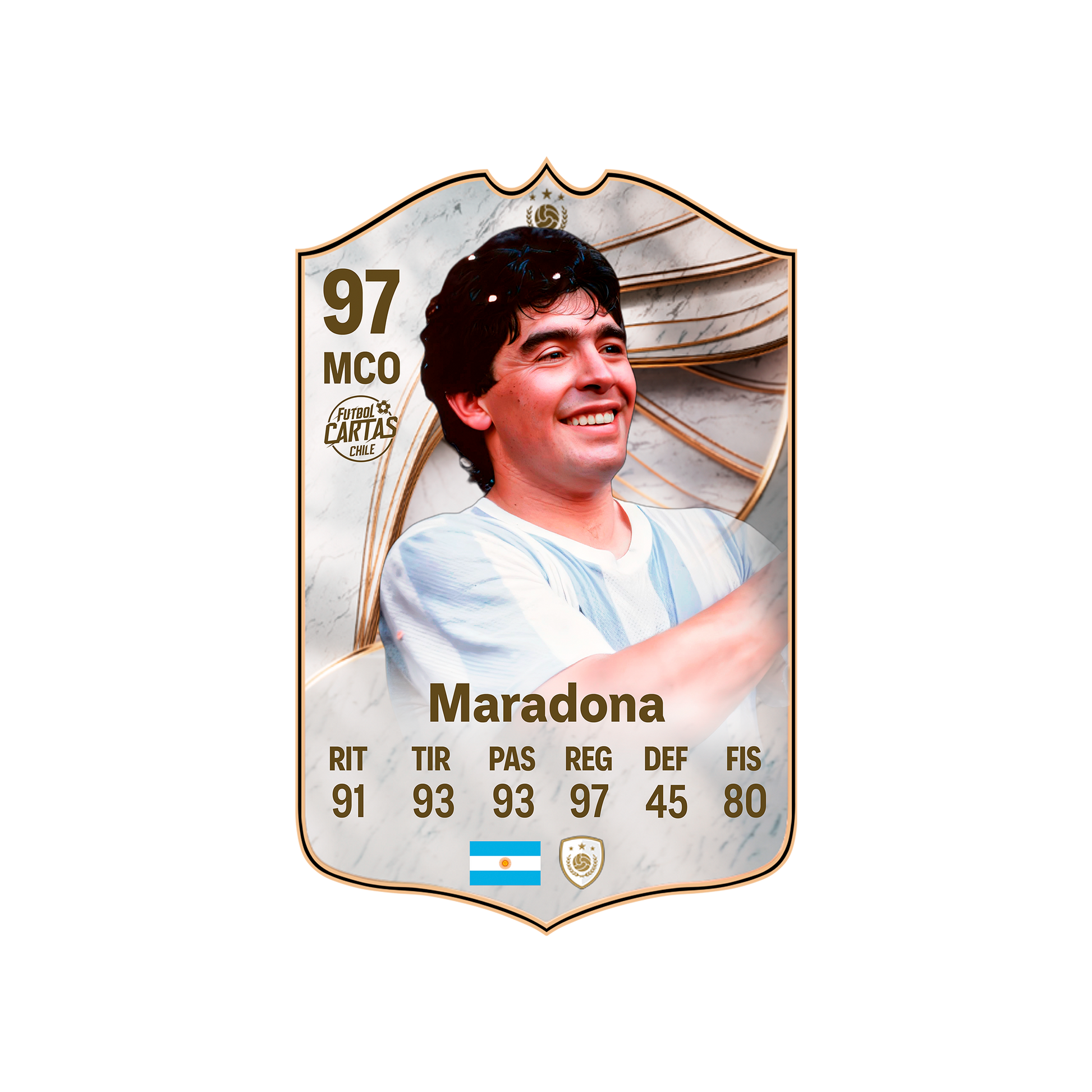 Llévate la carta de Diego Maradona ICONO FC26 en tamaño real. Es un diseño original de Futbol Cartas Chile, inspirado en el estilo de las cartas especiales de los videojuegos de fútbol. Ideal para fans de Diego Maradona y coleccionistas que quieren llevar su pasión por el fútbol a la vida real con una carta en gran formato. Perfecta como regalo futbolero o para decorar tu pieza, gaming room o espacio de colección.