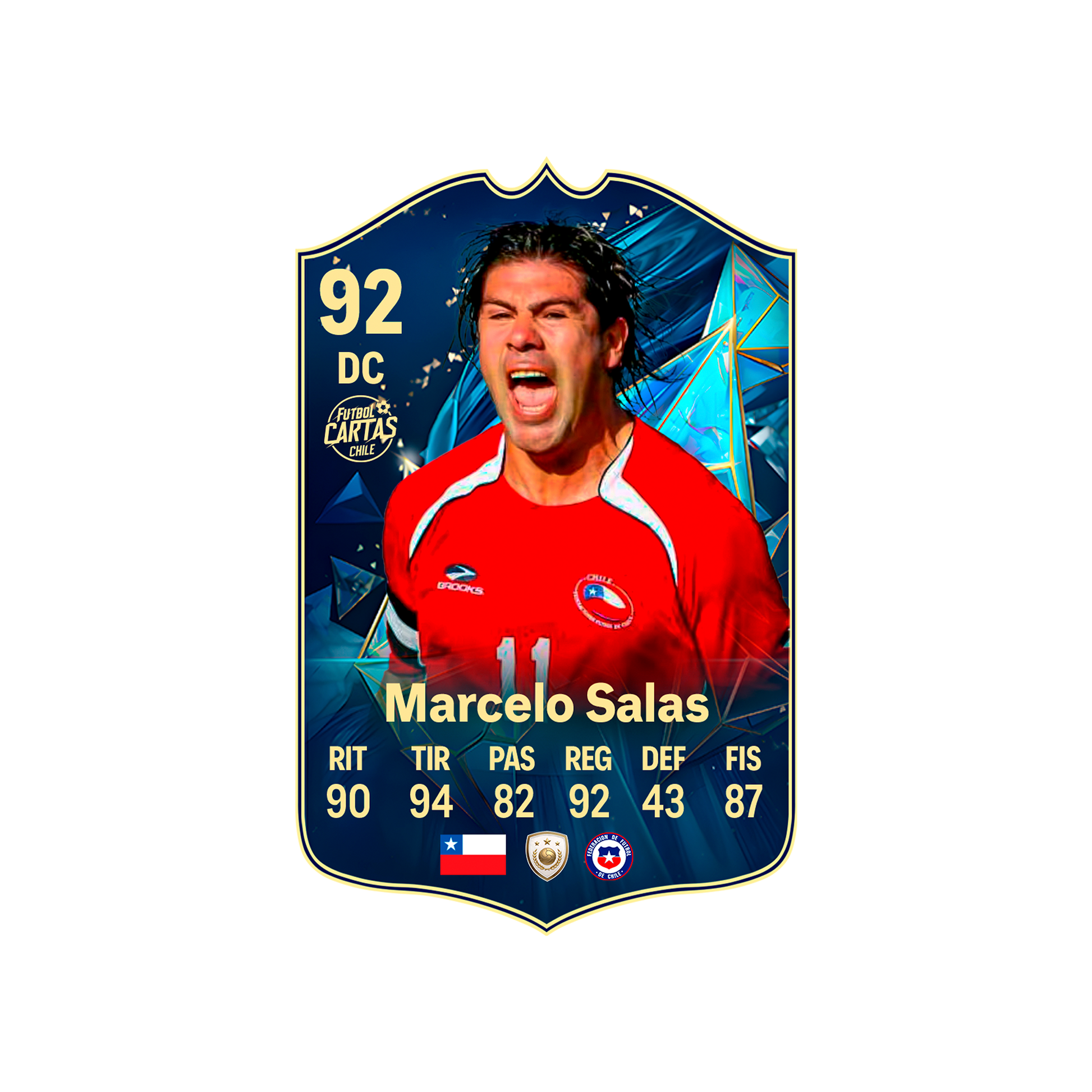 Llévate la carta de Marcelo Salas TOTS FC25 en tamaño real. Es un diseño original de Futbol Cartas Chile, inspirado en el estilo de las cartas especiales de los videojuegos de fútbol. Ideal para fans de Marcelo Salas y coleccionistas que quieren llevar su pasión por el fútbol a la vida real con una carta en gran formato. Perfecta como regalo futbolero o para decorar tu pieza, gaming room o espacio de colección.