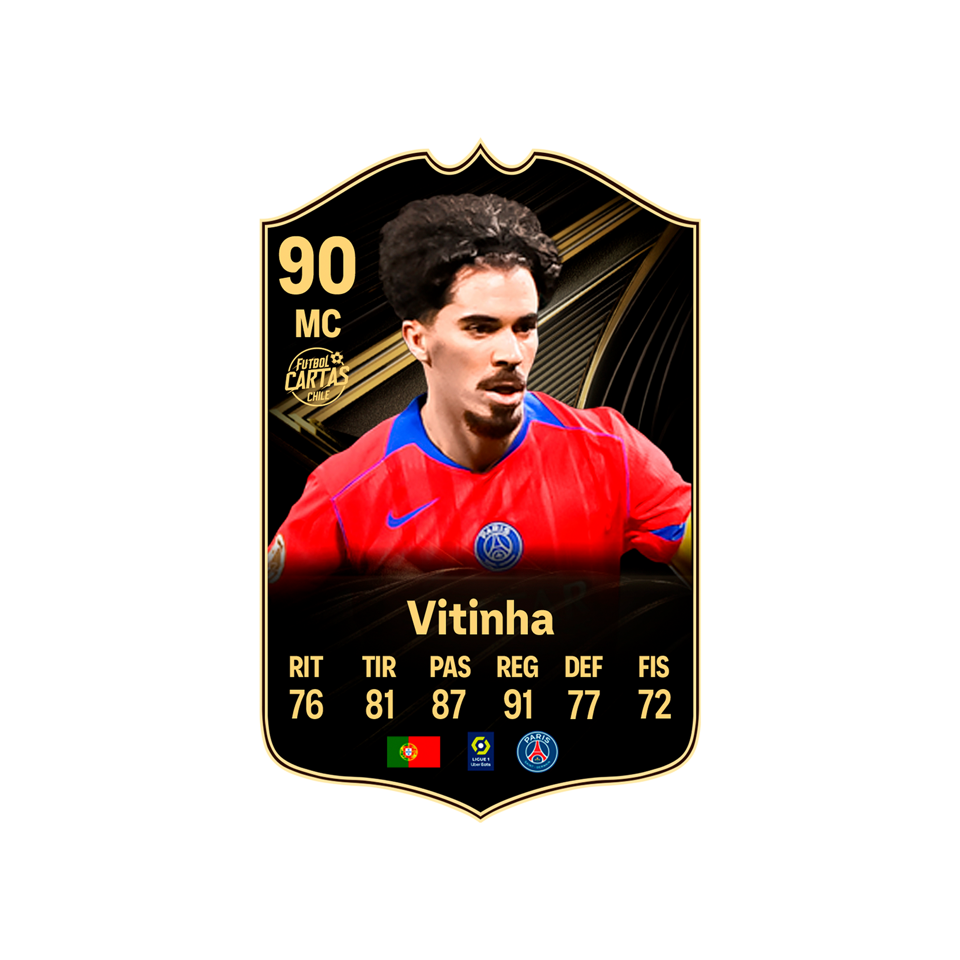 Carta oficial en tamaño real de Vitinha TOTW FC 26, inspirada en su carta Team of the Week de Ultimate Team. Una pieza de colección perfecta para fans de Vitinha, del fútbol elegante en el medio campo y de las cartas especiales de EA Sports FC.